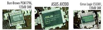 Xonar HDAV1.3 invents its fantastic audio quality with proprietary ASUS AV200, high quality oversampling digital to analog converters (Burr-Brown PCM1796, 123dB SNR), National Semiconductor LM4562 OP AMP, and analog-to-digital converter (Cirrus Logic CS5381, 120dB SNR).